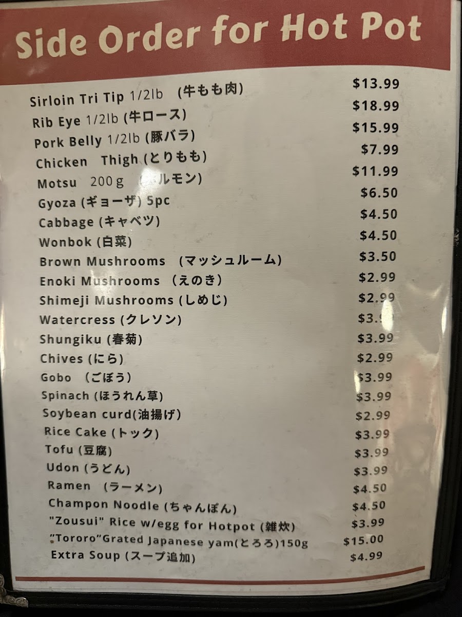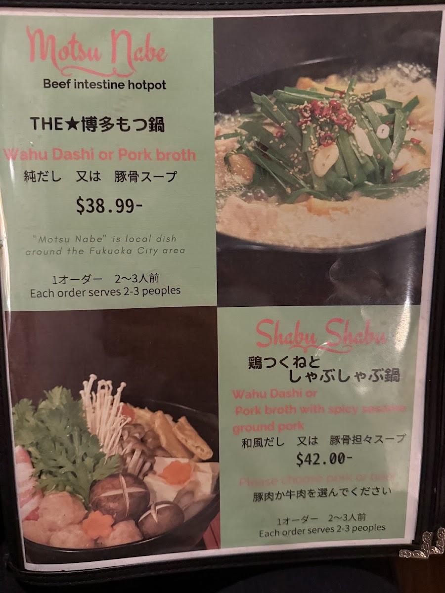 Highlights include comforting options like the rich もつ鍋 (beef intestine hotpot), fresh assortments of sashimi, and satisfying small plates such as salt and pepper wings or roasted corn. Seasonal and authentic touches, like monk fish liver with ponzu or Kanpachi sashimi, add depth to the everyday offerings.